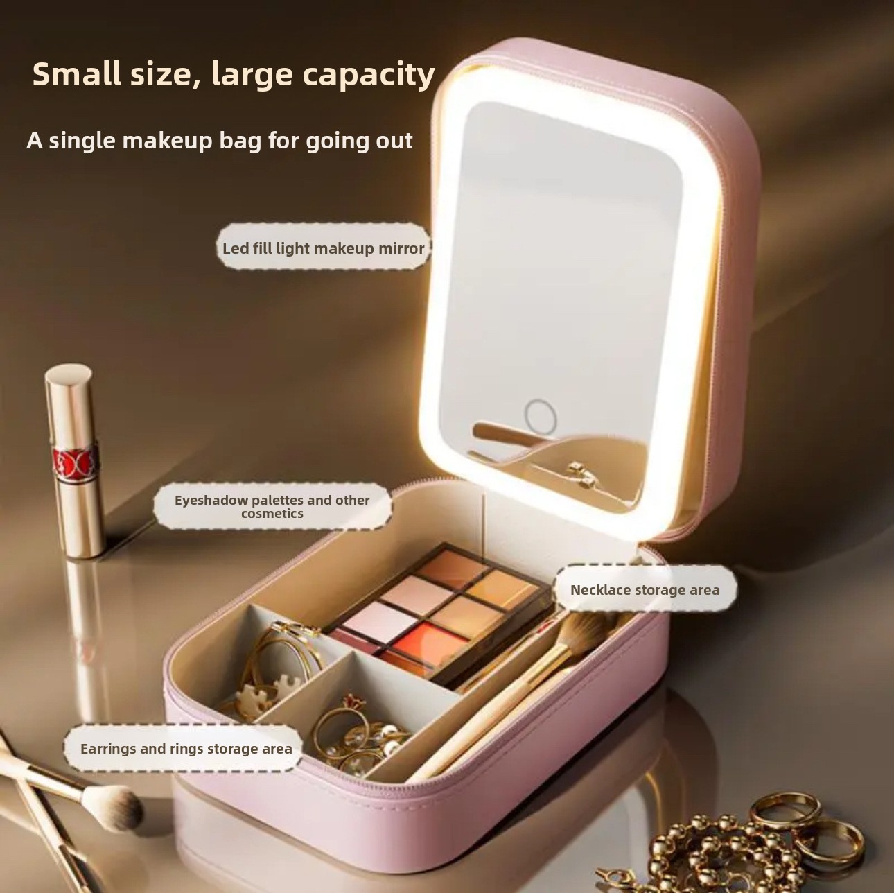 Partitioned Storage: Multiple compartments and jewelry sections for organized, tangle-free accessory storage.
